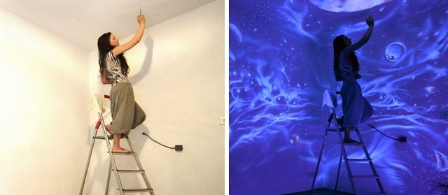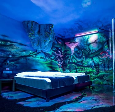 From adolescence onward, she became increasingly interested in luminescent materials, especially phosphorescent pigments that react to black light and darkness. This obsession eventually laid the foundation for her signature style: site-specific installations and glowing murals that transform in different lighting conditions. These artworks are not static; they evolve throughout the day, offering entirely distinct visual experiences in daylight, twilight, and total darkness. Such transformative art had rarely been seen before in contemporary Europe, and Fabian stood at the forefront of this emerging niche.